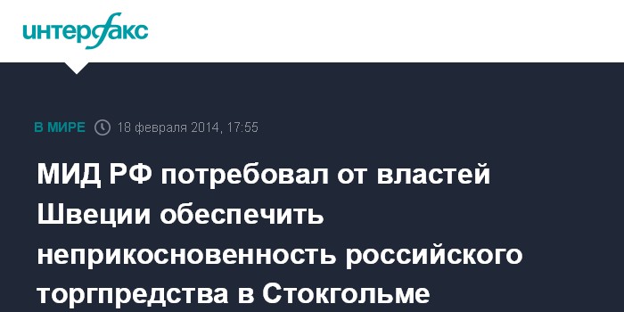 Москва. 18 февраля. INTERFAX.RU - В Москве рассчитывают, что шведские власти предпримут необходимые меры для обеспечения неприкосновенности здания российского торгпредства, и рассматривают аукцион по принудительной продаже этого здания как грубое нарушение норм международного права.