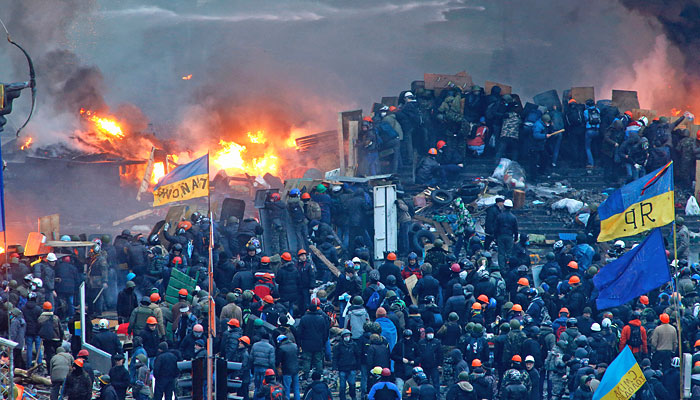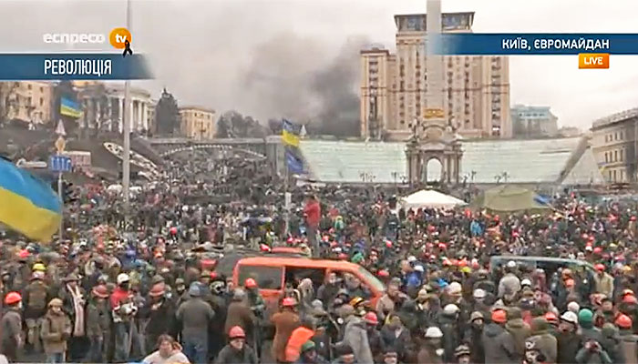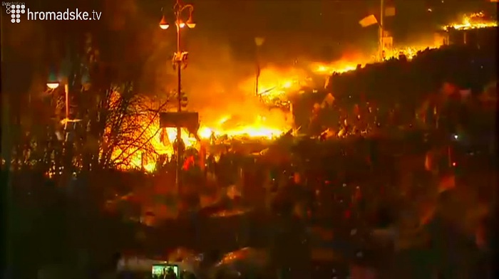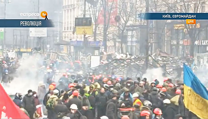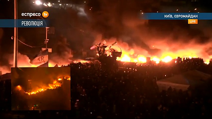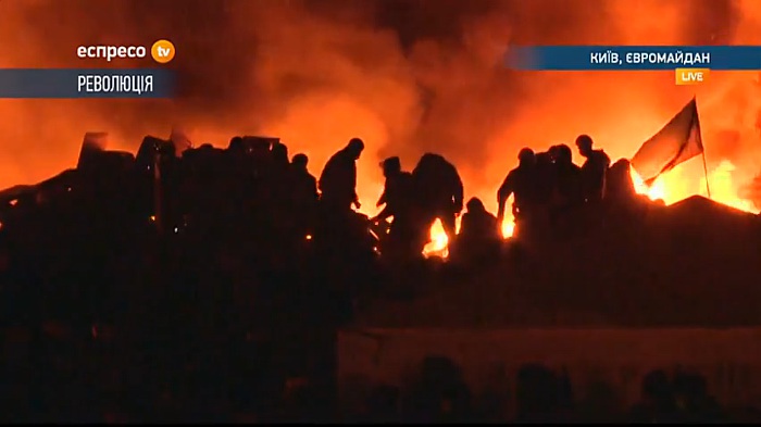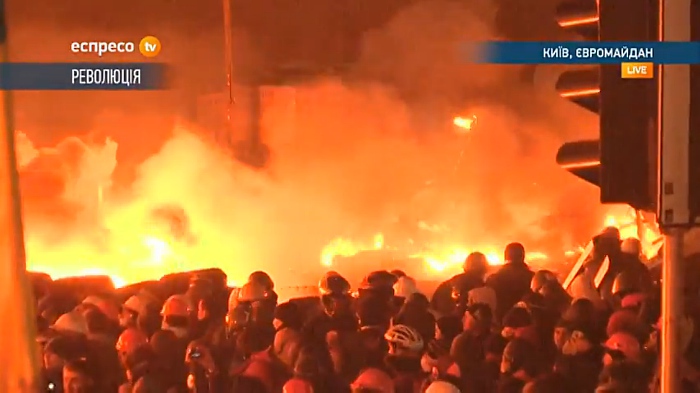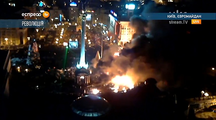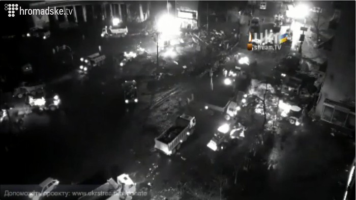 На майдане Незалежности идут позиционные бои. "Беркут" принимает против манифестантов водометы и светошумовые гранаты, те кидают в милиционеров бутылки с зажигательной смесью и камни. Пожары продолжают гореть.