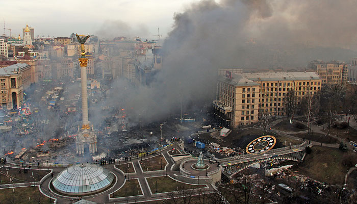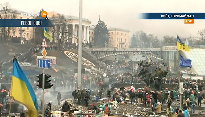 На улицах в центре Киева, в непосредственной близости от майдана Независимости, жильцы домов и работники магазинов на центральных улицах защищают свои окна и двери пенопластом во избежание их повреждения. В воздухе висит запах горелых покрышек. Люди передвигаются из подъезда в подъезд короткими перебежками. Слышен колокольный звон Михайловского собора