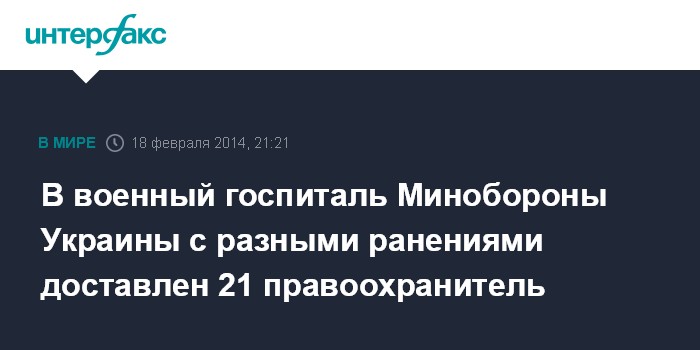 Киев. 18 февраля. INTERFAX.RU - 21 сотрудник правоохранительных органов доставлены на лечение во вторник в главный госпиталь Министерства обороны, сообщили в ведомстве.