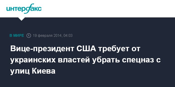 Москва. 19 февраля. INTERFAX.RU - Вице-президент США Джо Байден в телефонной беседе потребовал от президента Украины Виктора Януковича убрать бойцов спецназа с улиц украинской столицы, сообщил Белый дом.