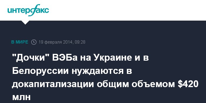 Москва. 19 февраля. INTERFAX.RU - Дочерние банки Внешэкономбанка (ВЭБа) на Украине и в Белоруссии нуждаются в докапитализации, сообщила в среду газета "Коммерсантъ" со ссылкой на информированные источники.