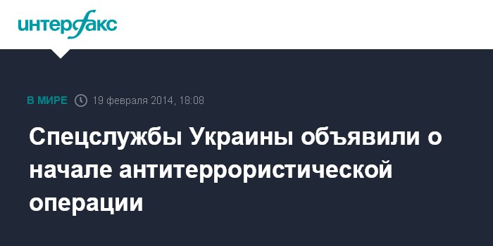 Москва. 19 февраля. INTERFAX.RU - Служба безопасности Украины и Антитеррористический центр Украины начинает антитеррористическую операцию на территории страны, говорится в заявлении главы СБУ Александра Якименко.