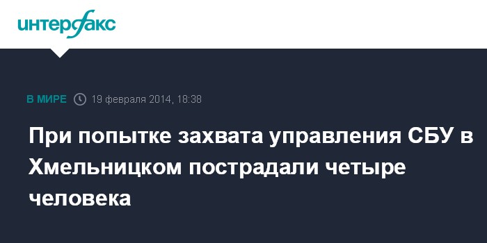 Москва. 19 февраля. INTERFAX.RU - В результате попытки захватить помещение областном управлении СБУ в Хмельницком пострадали четыре человека - 1 женщина и 3 мужчин, которые с телесными повреждениями туловища и конечностей доставлены в городскую больницу.