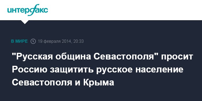 Москва. 19 февраля. INTERFAX.RU - Общественная организация "Русская община Севастополя" обратилась к руководству России с просьбой защитить русское население Севастополя и Крыма.