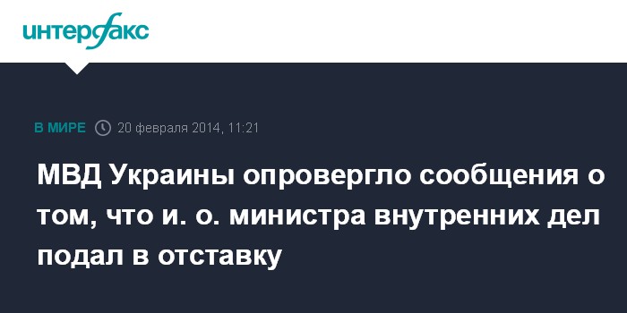 Киев. 20 февраля. INTERFAX.RU - В МВД заявляют, что и. о. министра внутренних дел Украины Виталий Захарченко находится на своем рабочем месте, а сообщения о том, что он якобы написал заявление об отставке, не соответствует действительности.