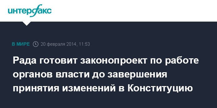 Киев. 20 февраля. INTERFAX.RU - На период урегулирования политического кризиса в Украине будет подготовлен согласованный законопроект, который обеспечит функционирование всех органов власти до окончательного завершения процесса принятия изменений в Конституцию, сообщает пресс-служба аппарата Верховной Рады.