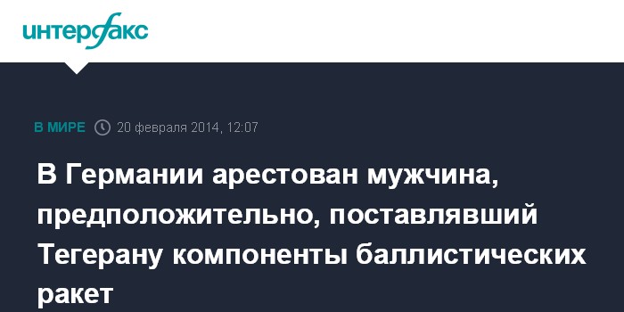 Берлин. 20 февраля. INTERFAX.RU - Сотрудники правоохранительных органов Германии арестовали мужчину, подозреваемого в переправке в Иран составных частей для производства баллистических ракет.