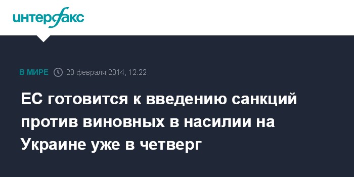 Париж. 20 февраля. INTERFAX.RU - Санкции в отношении тех, кто виновен в развязывании насилия на Украине, могут быть введены со стороны ЕС уже в четверг, сообщил в интервью французской радиостанции "Эроп-1" глава внешнеполитического ведомства Франции Лоран Фабиус.