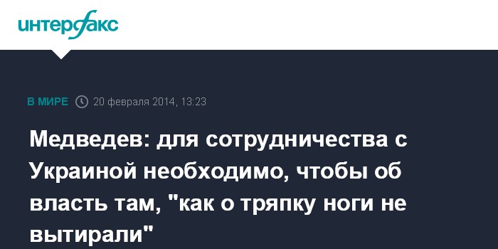 "Мы, конечно, с украинскими партнерами сотрудничество продолжим по всем направлениям, по которым договаривались, будем стараться делать все, чтобы исполнять те обещания, которые им давались, в то же время для этого необходимо, чтобы сами партнеры были в тонусе и чтобы власть, которая на Украине работает, была легитимной и эффективной, чтоб об эту власть, как о тряпку, ноги не вытирали", - заявил Медведев на заседании правительства РФ в четверг.