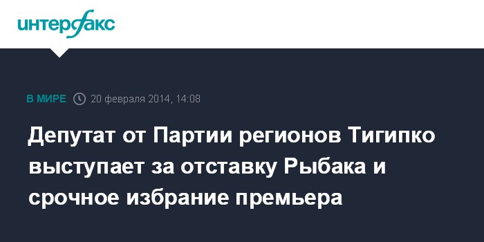 Москва. 20 февраля. INTERFAX.RU - Народный депутат Украины от фракции Партии регионов Сергей Тигипко считает, что для урегулирования кризиса в стране необходимо срочно предпринять ряд шагов, среди которых отставка спикера парламента Владимира Рыбака и срочное избрание премьер-министра, которого поддержат все фракции.
