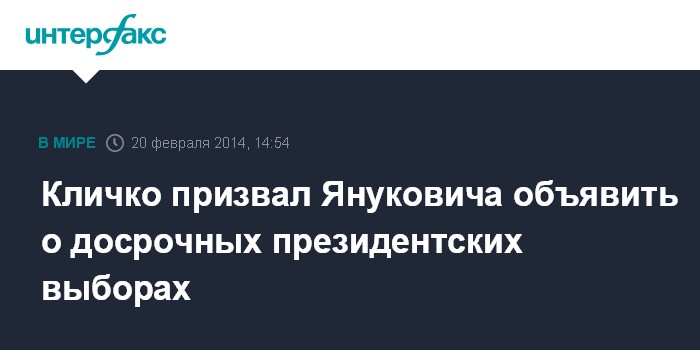 Москва. 20 февраля. INTERFAX.RU - Лидер партии УДАР Виталий Кличко призвал народных депутатов Украины срочно собраться на 15.00 в парламенте, чтобы принять решение о выходе из кризиса, а президента Украины Виктора Януковича - пойти на досрочные выборы президента.