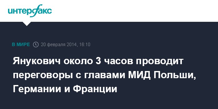 Киев. 20 февраля. INTERFAX.RU - Министры иностранных дел Польши, Германии и Франции уже около 3 часов ведут переговоры с президентом Украины Виктором Януковичем по ситуации в стране.