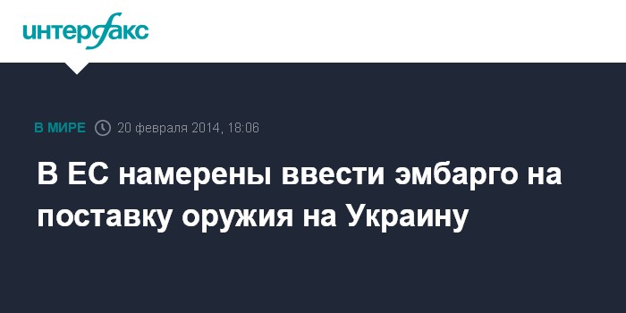 Москва. 20 февраля. INTERFAX.RU - Главы МИД стран ЕС позже в четверг могут принять решение о введении эмбарго на поставки оружия на Украину, пишет газета The Wall Street Journal со ссылкой на черновой вариант заявления министров.