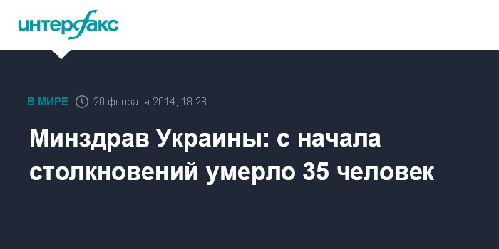 Москва. 20 февраля. INTERFAX.RU - По данным Минздрава Украины, с начала столкновений в Киеве умерло 35 человек.