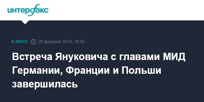 Москва. 20 февраля. INTERFAX.RU - Министры иностранных дел Польши Радослав Сикорский, Франции Лоран Фабиус и Германии Франк-Вальтер Штайнмайер, покинули здание администрации президента Украины после встречи с президентом Виктором Януковичем.