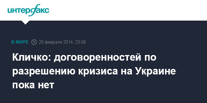 Москва. 20 февраля. INTERFAX.RU - Лидер партии "УДАР" Виталий Кличко заявляет, что никакие договоренности по разрешению кризиса в стране еще не достигнуты.
