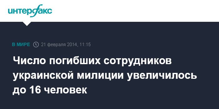 Москва. 21 февраля. INTERFAX.RU - Число сотрудников украинской милиции, погибших в ходе последних беспорядков, увеличилось до 16 человек, сообщает МВД Украины в четверг.