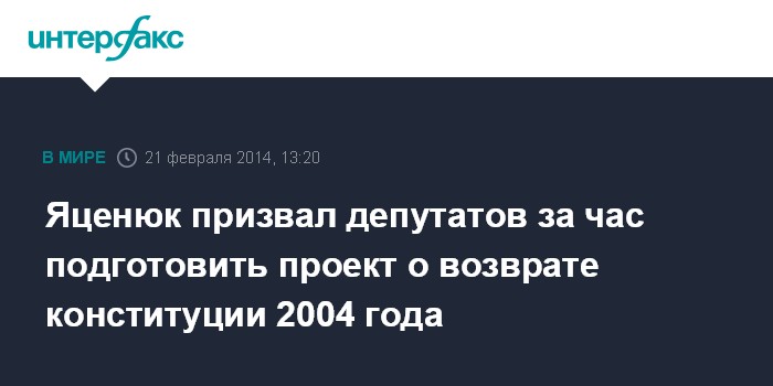 Москва. 21 февраля. INTERFAX.RU - Народные депутаты в течение ближайшего часа прямо в зале намерены работать над проектом постановления о возвращении конституции Украины 2004 года.