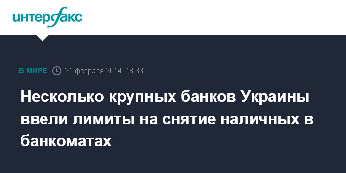 Ограничения также ввел крупнейший на Украине Приватбанк - с 21 февраля в размере 3 тыс. грн. в сутки на одну карту, "Райффайзен Банк Аваль" - с 20 февраля, в размере 2,5 тыс. грн. Государственный Ощадбанк не планирует снижать размер лимита на обналичивание средств по своим платежным картам, вместе с тем банк установил лимит на снятие наличных средств через свои банкоматы для клиентов других банков в размере 500 грн. на одну карту. Все банки объясняют такое решение необходимостью предоставить всем клиентам возможность обналичить средства.