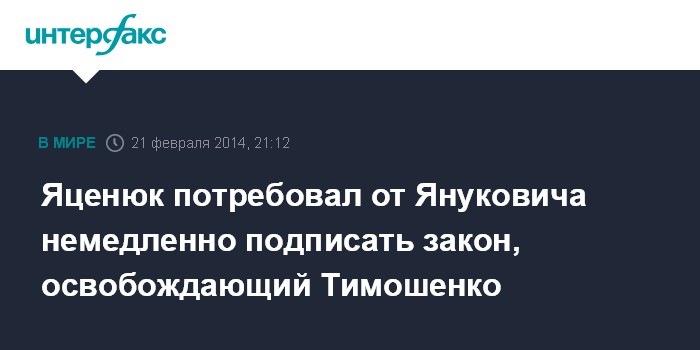 Москва. 21 февраля. INTERFAX.RU - Лидер фракции "Батькивщина" Арсений Яценюк требует от президента Украины Виктора Януковича немедленно подписать законы, принятые в пятницу в Верховной Раде.