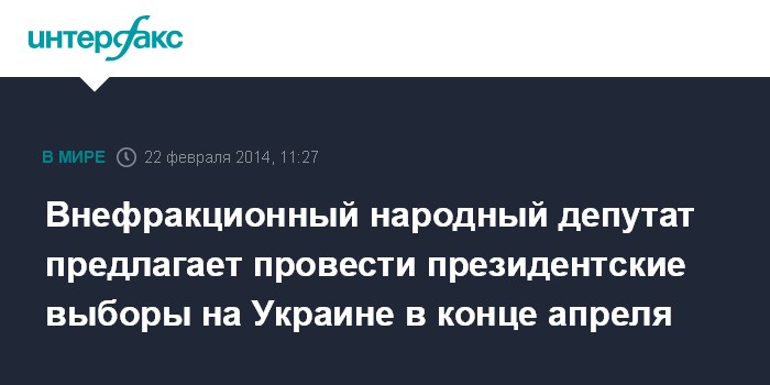 Москва. 22 февраля. INTERFAX.RU - Народный депутат Украины (внефракционный) Олег Ляшко инициирует назначение досрочных президентских выборов на 27 апреля текущего года. Соответствующий проект постановления зарегистрирован в Верховной Раде в субботу. Текст документа отсутствует, указана только предлагаемая дата выборов - 27 апреля 2014 года.