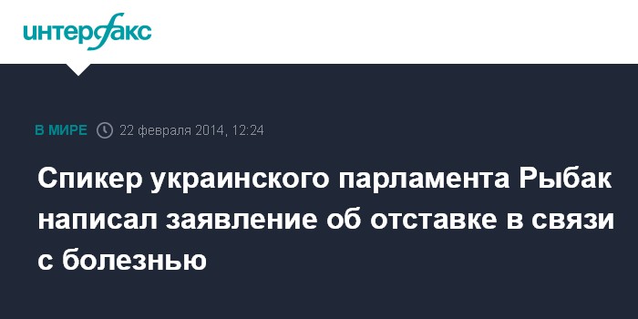 Москва. 22 февраля. INTERFAX.RU - Председатель Верховной Рады Украины Владимир Рыбак написал заявление об отставке в связи с болезнью, заявил вице-спикер Руслан Кошулинский. "Информирую вас о том, что председатель Верховной Рады Рыбак Владимир Васильевич написал заявление в связи с болезнью и лечением - он просит снять с себя полномочия председателя Верховной Рады", - заявил Р.Кошулинский, открывая заседание парламента в субботу.
