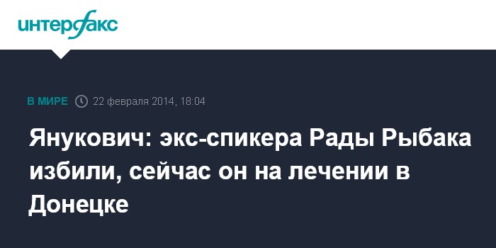 Москва. 22 февраля. INTERFAX.RU - Президент Украины Виктор Янукович заявляет, что Владимира Рыбака, который написал заявление об отставке с поста спикера Верховной Рады, избили. "Его избили. Он приехал ко мне. По пути стреляли. Он попросил, чтобы я его забрал. Я его забрал и отправил его в Донецк на лечение", - сказал он в интервью телеканалу UBR.