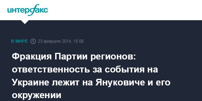 Москва. 23 февраля. INTERFAX.RU - Ответственность за жертвы в ходе столкновений на Украине лежит на Викторе Януковиче и его ближайшем окружении, говорится в заявлении фракции Партии регионов в Верховной Раде Украины, обнародованном в воскресенье. "Мы переживаем один из самых сложных и трагических периодов в истории нашей Родины. Украина оказалась обманутой и ограбленной. Но даже это ничто перед горем, с которым столкнулись десятки украинских семей, потерявших своих близких по обе стороны противостояния. Украину предали, а людей столкнули лбами. Вся ответственность за это лежит на Януковиче и его ближайшем окружении", - говорится в заявлении.