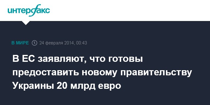 Москва. 24 февраля. INTERFAX.RU - После формирования на Украине нового правительства ЕС готов предоставить Киеву 20 млрд евро на проведение реформ, заявил глава комитета по иностранным делам Европейского парламента Элмар Брок.