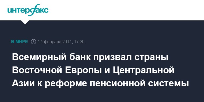 Душанбе. 24 февраля. INTERFAX.RU - Всемирный банк (ВБ) призывает страны Восточной Европы и Центральной Азии провести реформы пенсионной системы, чтобы обеспечить ее адаптацию к меняющейся демографической ситуации.