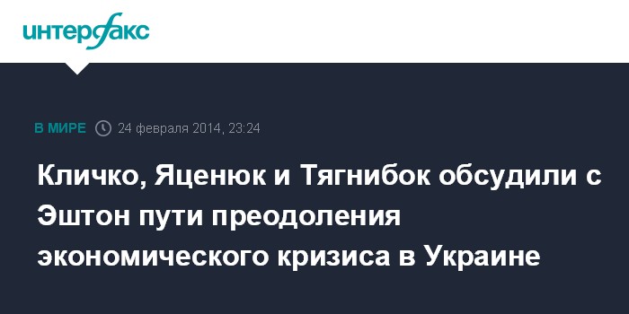Киев. 24 февраля. INTERFAX.RU - Лидер "УДАРа" Виталий Кличко, лидер "Батькивщины" Арсений Яценюк и лидер "Свободы" Олег Тягнибок встретились с верховным представителем по иностранным делам и политике безопасности Европейского Союза Кэтрин Эштон.