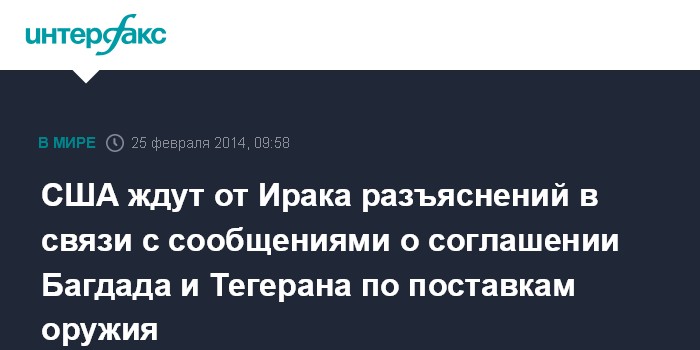 Вашингтон. 25 февраля. INTERFAX.RU - США выражают серьезную обеспокоенность в связи с сообщениями о соглашении по поставкам оружия из Ирана в Ирак и хотят получить объяснения от иракских властей, заявила официальный представитель госдепартамента США Дженнифер Псаки.