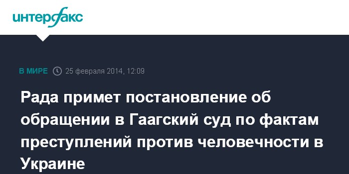 Киев. 25 февраля. INTERFAX.RU - Верховная Рада Украины во вторник намерена рассмотреть проект постановления о заявлении Украины в Международный уголовный суд относительно фактов совершенных преступлений против человечности во время проведения в стране массовых акций протеста.