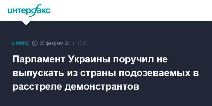 Москва. 25 февраля. INTERFAX.RU - Верховная рада Украины поручила Государственной пограничной службе не выпускать с территории страны граждан, которые фигурируют в деле об убийствах граждан во время массовых акций протеста.