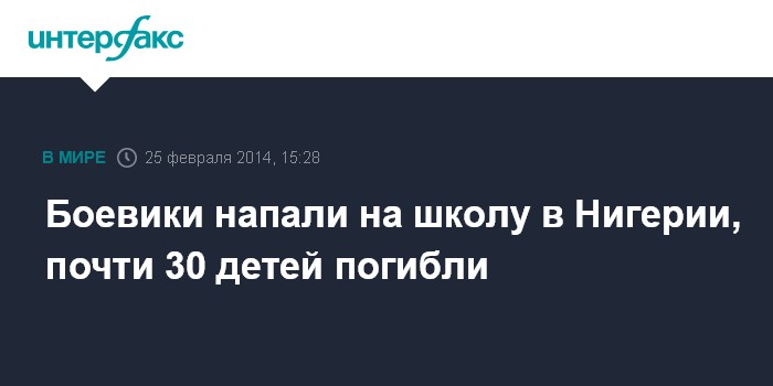 Вашингтон. 25 февраля. INTERFAX.RU - Двадцать девять учеников школы-интерната стали жертвами нападения вооруженных боевиков в штате Йобе на северо-востоке Нигерии, сообщили во вторник власти страны.