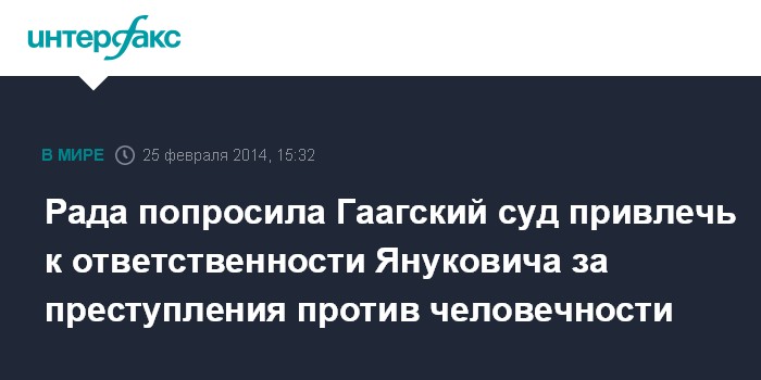 Киев. 25 февраля. INTERFAX.RU - Украинский парламент принял за основу обращение в Международный уголовный суд с призывом установить и привлечь к ответственности высших должностных лиц Украины, в том числе Виктора Януковича, за преступления против человечности во время мирных акций протеста граждан с 30 ноября 2013 года по 22 февраля 2014 года.