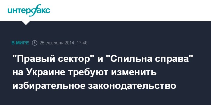 Москва. 25 февраля. INTERFAX.RU - Общественное движение "Спильна справа" и движение "Правый сектор" требуют полной замены состава Центральной избирательной комиссии, изменения избирательного законодательства и наказания всех организаторов фальсификаций предыдущих выборов на Украине.