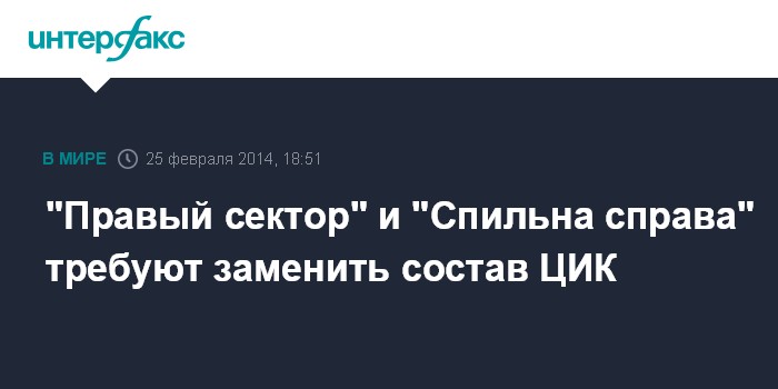 Киев. 25 февраля. INTERFAX.RU - Общественное движение "Спильна справа" и движение "Правый сектор" требуют полной замены состава Центральной избирательной комиссии (ЦИК), изменения избирательного законодательства и наказания всех организаторов фальсификаций предыдущих выборов в Украине.