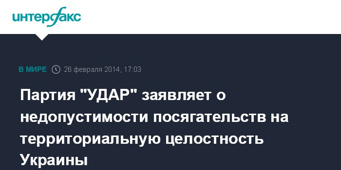 Киев. 26 февраля. INTERFAX.RU - Партия "УДАР" заявляет, любые посягательства на территориальную целостность Украины недопустимы.