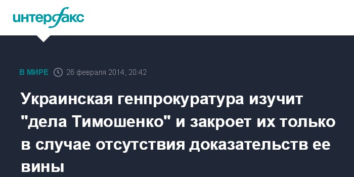 Москва. 26 февраля. INTERFAX.RU - И.о. генпрокурора Украины Олег Махницкий заверяет, что все уголовные дела в отношении экс-премьера Юлии Тимошенко могут быть закрыты, только если не будет доказательств ее вины.