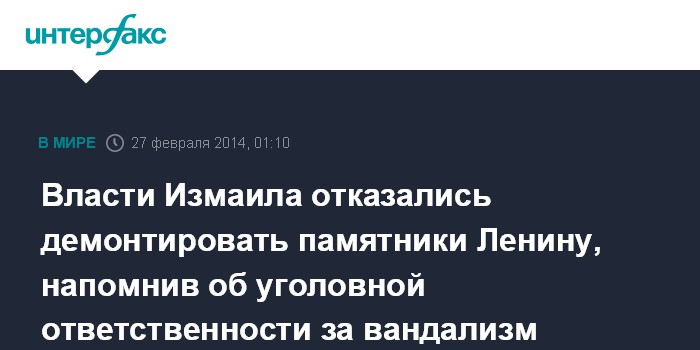 "Вопрос демонтажа памятников В.И.Ленину прямо затрагивают политические, социальные, культурные интересы всех жителей Измаила, а значит, должен рассматриваться исключительно в рамках действующего законодательства, то есть на основании результатов общественных слушаний, где будет учтено мнение каждого члена громады нашего города", - отметили в горсовете и подчеркнули, что за незаконное умышленное уничтожение, повреждение памятников предусмотрена уголовная ответственность.