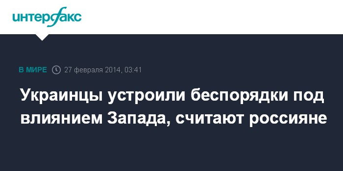 Москва. 27 февраля. ИНТЕРФАКС - Россияне в большинстве своем следят за событиями на Украине и уверены, что протестные акции в Киеве связаны с влиянием Запада, сообщают социологи.