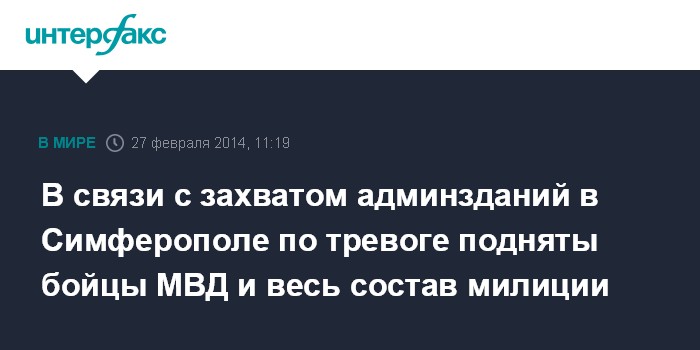 Киев. 27 февраля. INTERFAX.RU - В связи с захватом вооруженным огнестрельным оружием отрядом неизвестных здания верховного совета АР Крым по тревоге подняты бойцы внутренних войск МВД в автономии а также весь состав милиции, сообщил и. о. министра внутренних дел Украины Арсен Аваков.