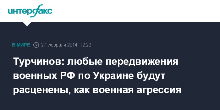 Киев. 27 февраля. INTERFAX.RU - Председатель Верховной Рады Украины, и.о. главы государства Александр Турчинов призывает военнослужащих ЧФ РФ, находящихся в Крыму, не покидать границы территорий, определенных соответствующими соглашениями.