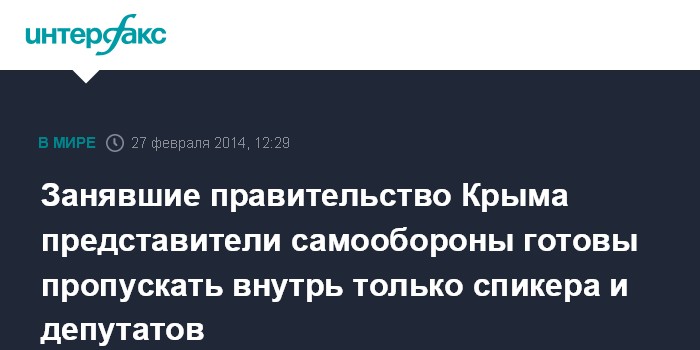 Москва. 27 февраля. INTERFAX.RU - Представители отряда самообороны Крыма, которые контролируют здание Совета министров автономии, заявили о намерении пропускать внутрь здания только спикера парламента Крыма и законно избранных депутатов, сообщает телеканал "Россия 24".