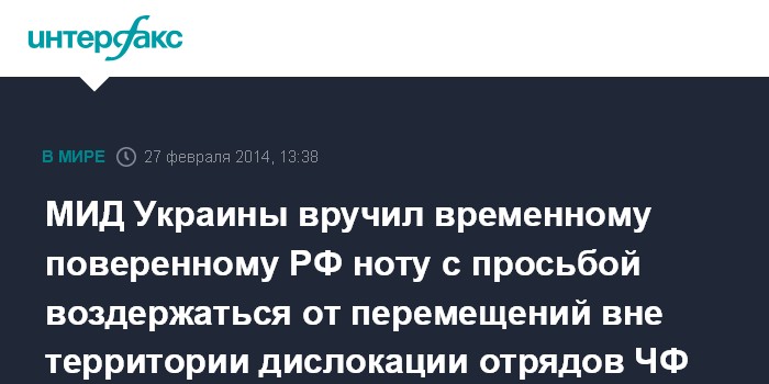 Москва. 27 февраля. INTERFAX.RU - В украинский МИД вызван временный поверенный России Андрей Воробьев, которому были вручены ноты, касающиеся последних событий на Украине, а также перемещений подразделений ЧФ РФ вне территории их дислокации.