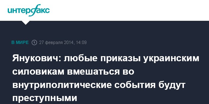 Москва. 27 февраля. INTERFAX.RU - Президент Украины Виктор Янукович заявил, что любой приказ о применении Вооруженных сил внутри страны будет являться преступлением.