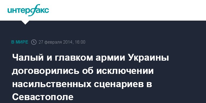 Москва. 27 февраля. INTERFAX.RU - В Севастополе председатель координационного совета по организации Севастопольского городского управления по обеспечению жизнедеятельности Севастополя, российский бизнесмен Алексей Чалый и начальник Генерального штаба - Главнокомандующий Вооружённых Сил Украины адмирал Игорь Ильин договорились об исключении насильственных сценариев.