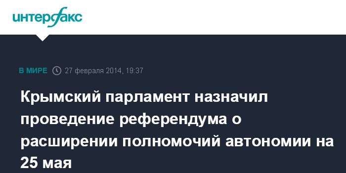 В соответствии с постановлением крымский парламент принял решение провести 25 мая 2014 года референдум, на который будет вынесен вопрос "Автономная республика Крым обладает государственной самостоятельностью и входит в состав Украины на основе договоров и соглашений (да или нет)".
